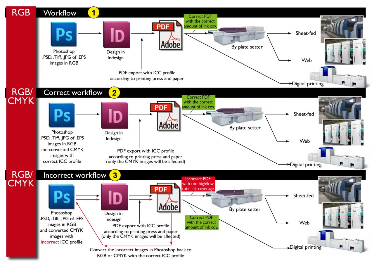 Before creating the PDF, it is important that the images and photos placed have a correct colour profile. We distinguish 3 workflows.